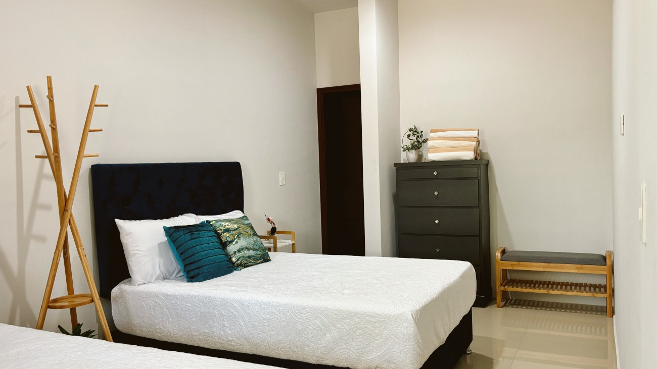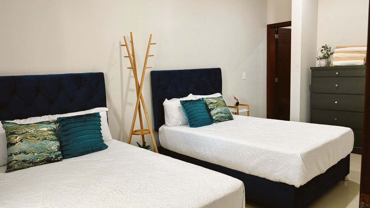 *La primera habitación* está equipada con dos amplias camas queen size y aire acondicionado para garantizarte un descanso placentero en un ambiente fresco.