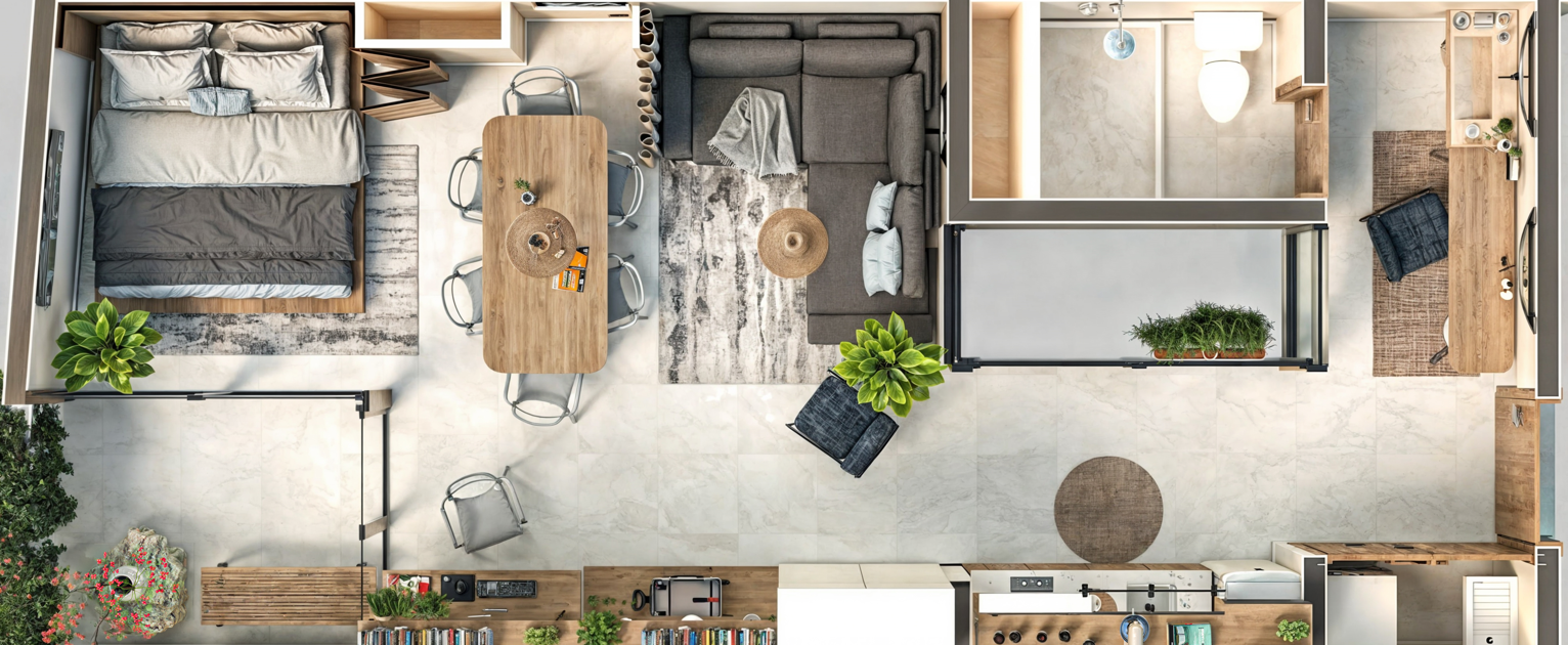 Los departamentos están diseñados con una distribución eficiente que maximiza el espacio y ofrece todo lo necesario para una experiencia vacacional cómoda y atractiva para los huéspedes.